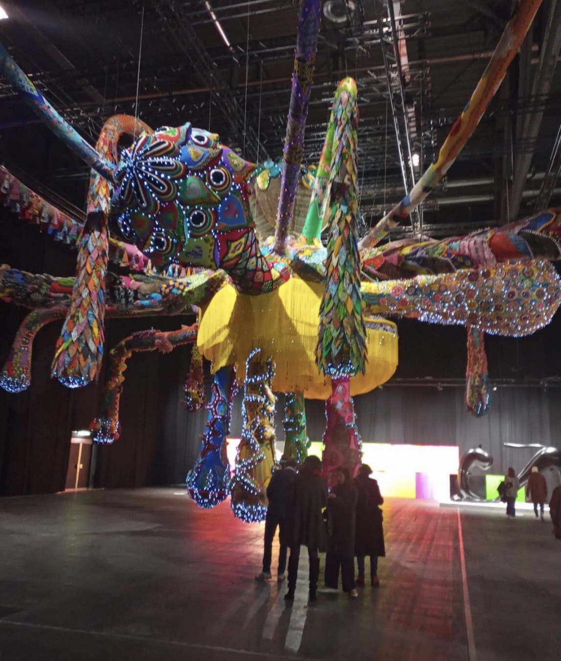 “Fun Fair” was based on five monumental works. With its immense tentacles covered in shimmering fabric,a strange creature that seems to be part spider, part octopus towers over the space in the half light. Multicoloured embroidery, curtains of yellow fringes, pompoms… it was a textile monster whose beauty was as sovereign as it was nasty.