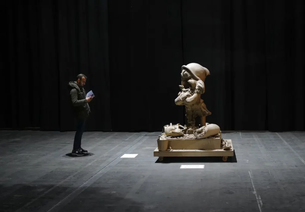 The American Paul McCarthy was immortalised in bronze the portrait of Grumpy, one of Snow White’s seven dwarfs.When you approach its familiar figure,it was shocking to see him as he had been hit by a bomb.
