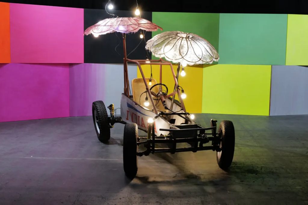 Another Geneva gallery was the Xippas Gallery presented with an installation by American artist Blair Thurman. The artist is facinated by the world of cars and popular culture, created a wall of colourful abstract canvases and a bagy decorated with parasols intitled “Mexico set” and “Obut (Indiana)”. This 12 meter long wall evokes the curve of the racetrack completed by the car .