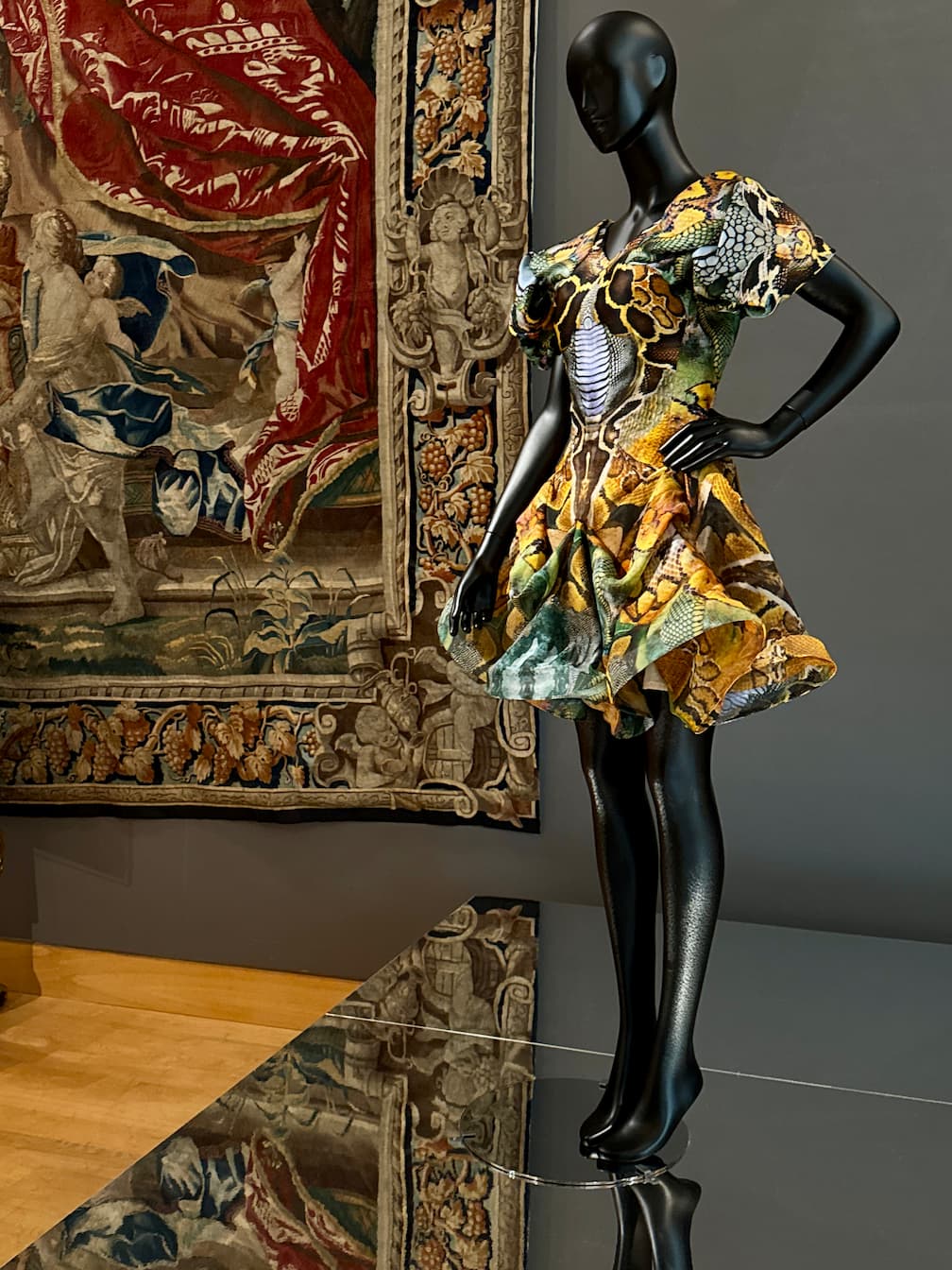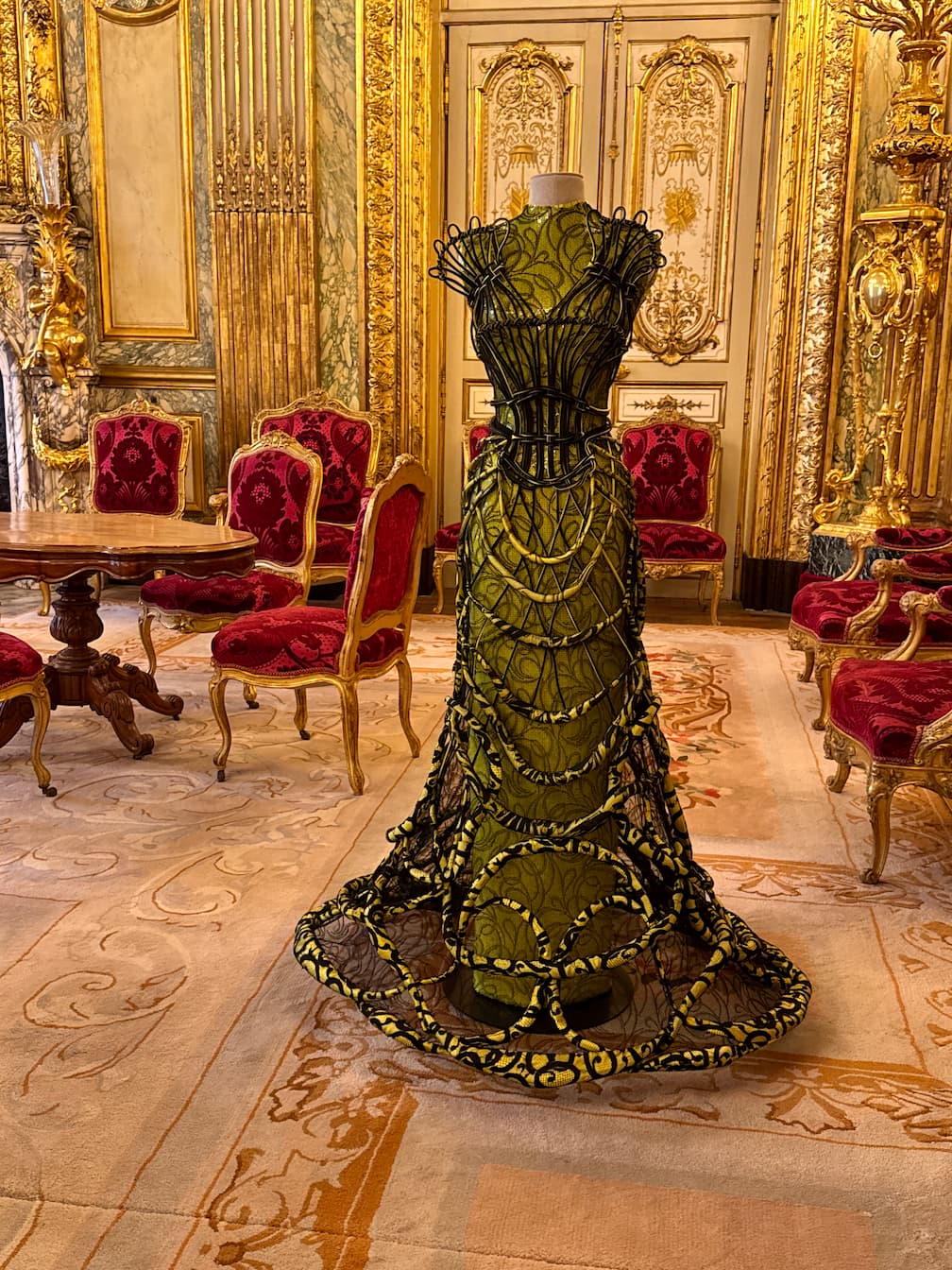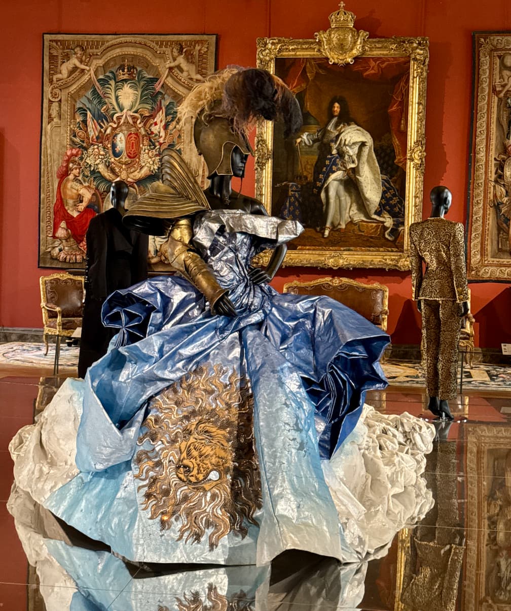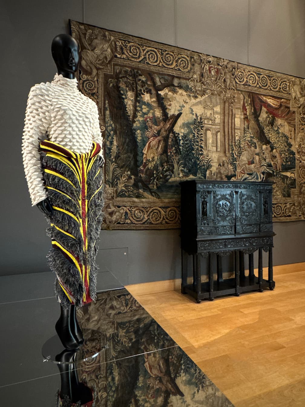 Visitors head to Byzantium and the Middle Ages, where the most precious works – gold, ivory and precious stones – are reflected in sublime silhouettes, proudly perched on mirrored catwalks that give the museum’s galleries a catwalk feel. In the Renaissance rooms, majestic tapestries, glazed ceramics and finely crafted suits of armour also act as accomplices to the designer pieces.