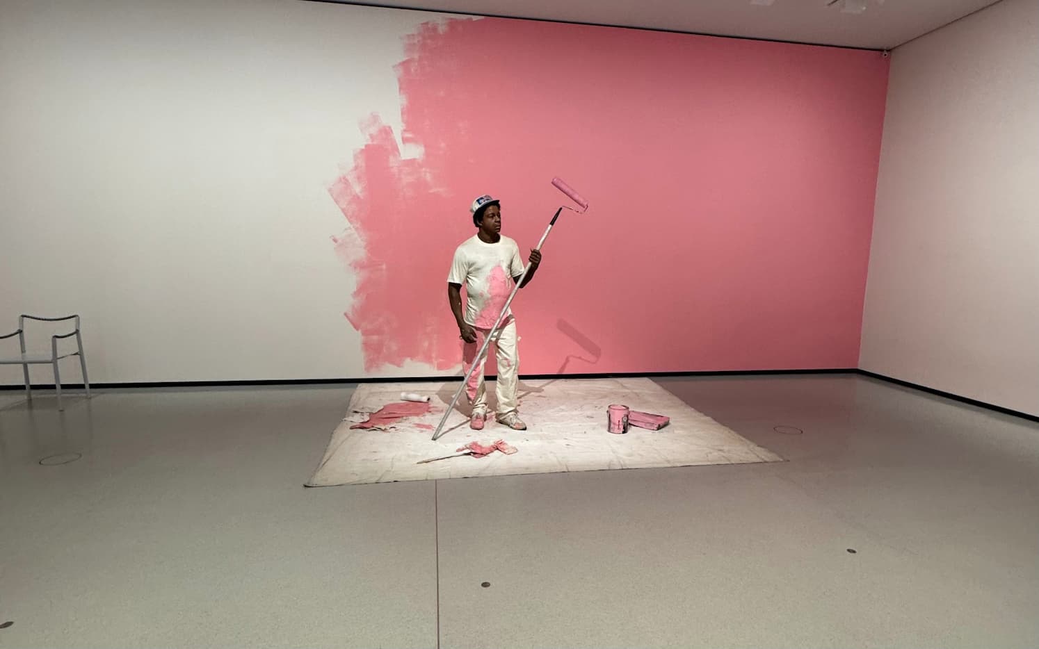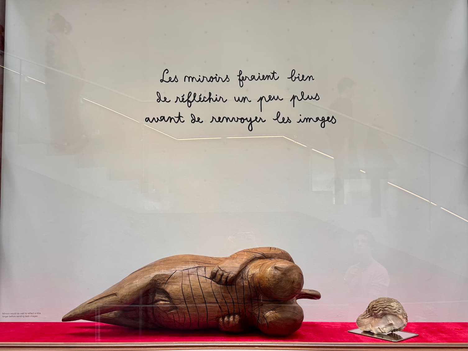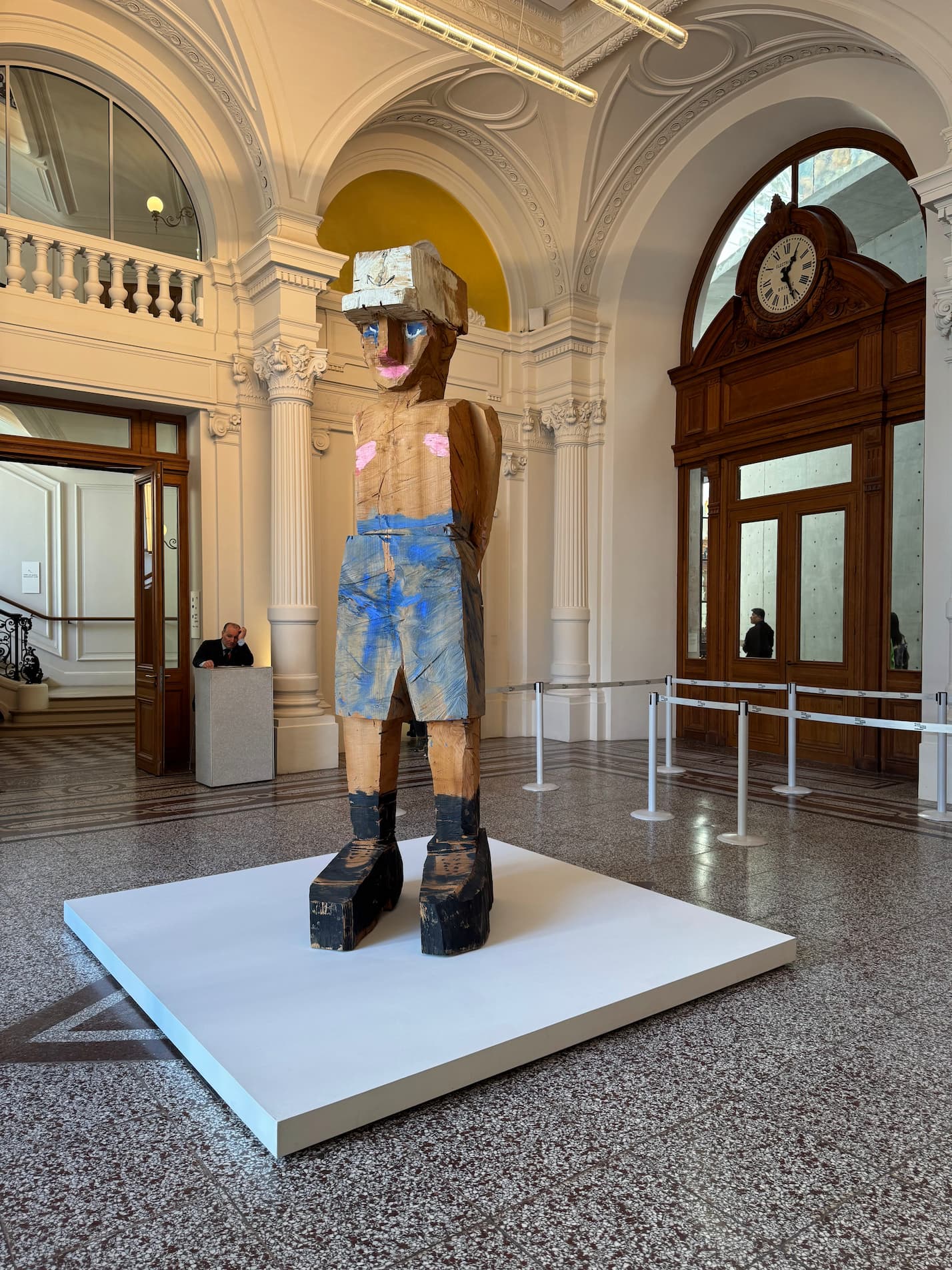 Duane Hanson, known for his hyper-realistic sculptures, captures the ordinary with unusual precision. In the exhibition, his immobile figures, seated or standing, seem to be waiting for a moment that will never come.