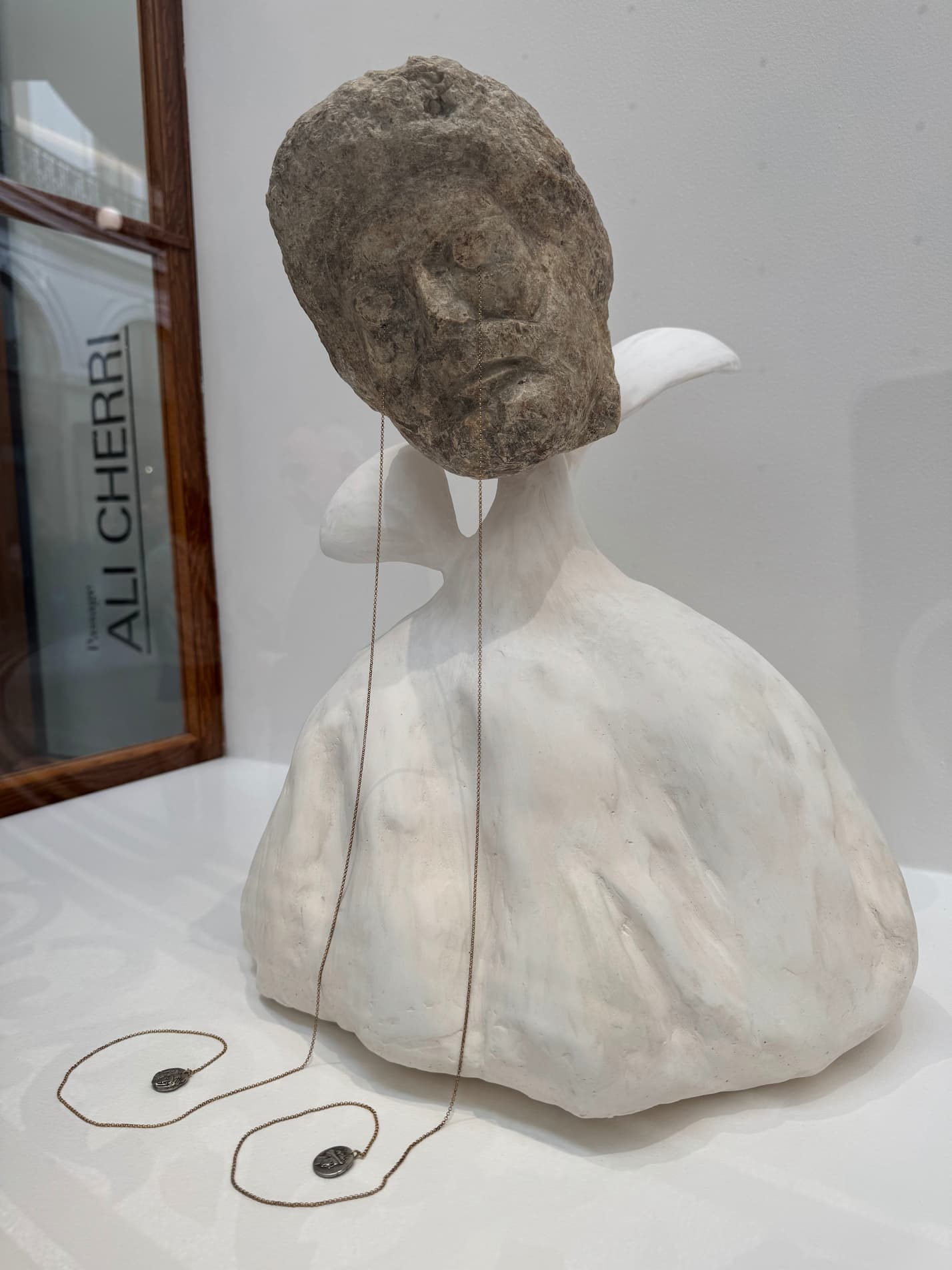 Ali Cherri, Grafting (I), 2019, Head of a woman or Apollo, sculpture stone statue of Bishop (Normandy), plaster, metal nails. Courtesy of the artist and the Imane Gallery.
