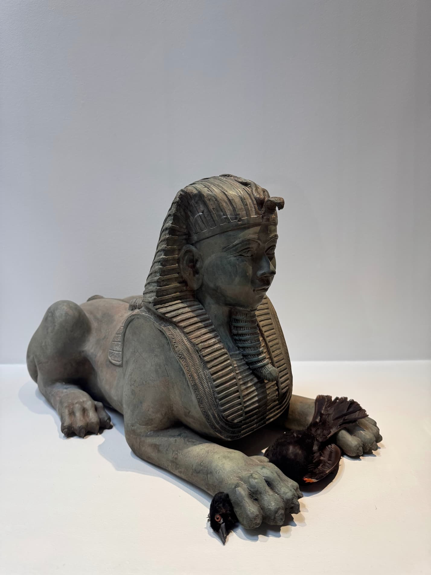 19 th Century painted bronze sphinx, taxidemy bird. Private collection.