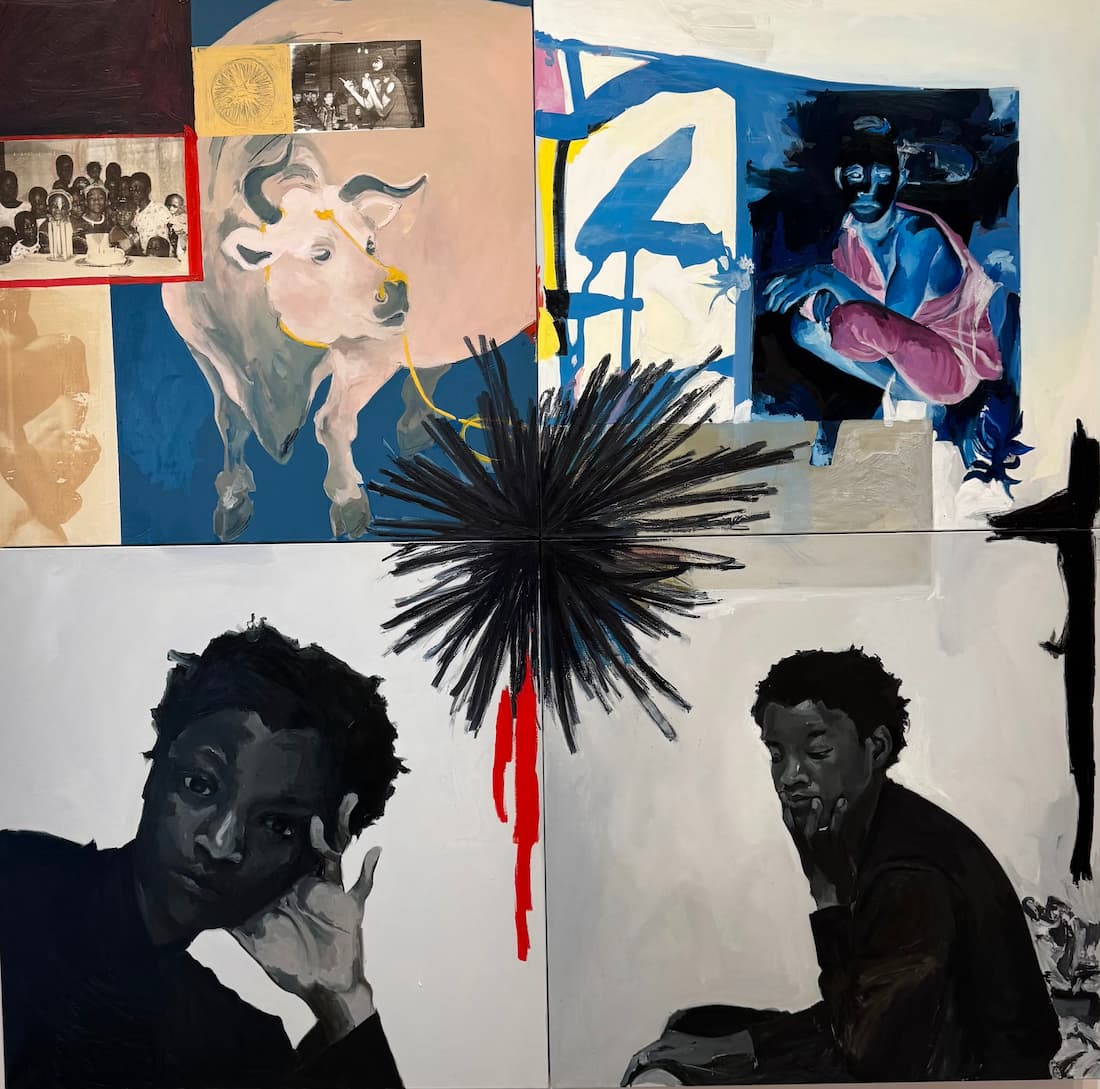 The poetic, coloful diptych of the Ghanaian painter Gideon Appah welcomes visitors to the Salon; his paintings emerge from his childhood imagination, local mythologies, ethereal landscapes, rivers, domestic interiors and recurring figures, both imagined and unknown, such as his grandmother and brother.
