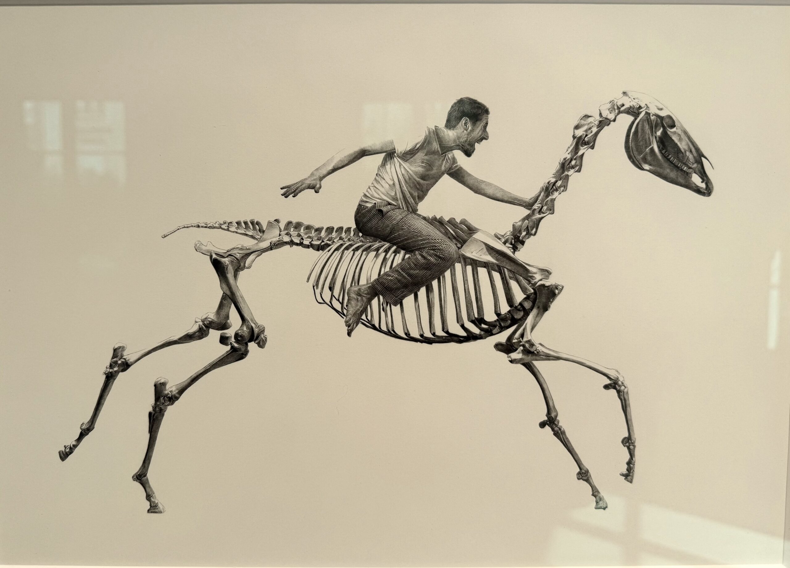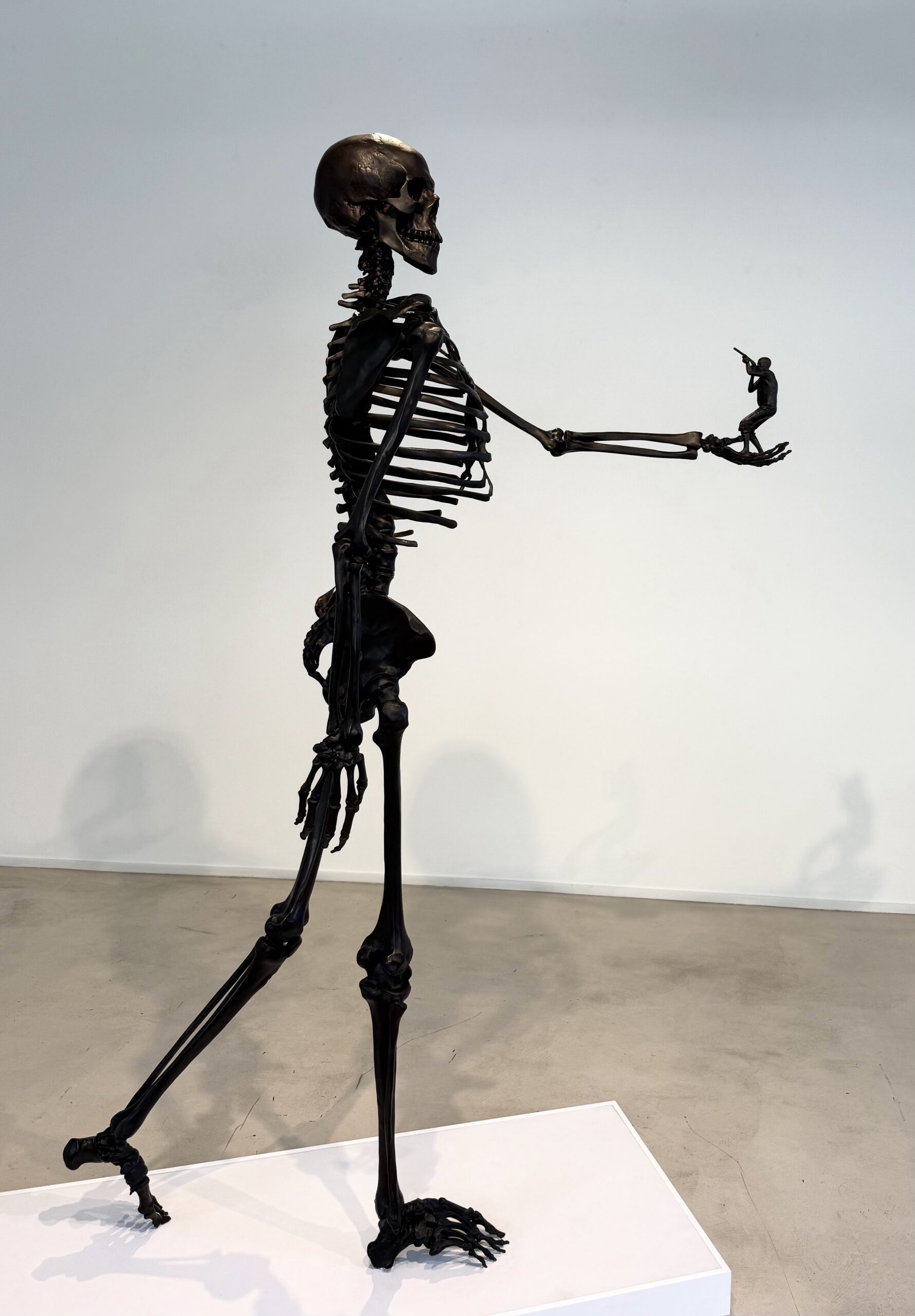 At the entrance of the gallery, the huge black sculpture of a skeleton walking with determination to carry out his catastrophic intentions, holding that tiny courageous man in his hand that holding a miniature pistolet and shooting through the skeleton’s head without success, skeleton completely ignores this tiny, courageous man even turns his gaze to another side!